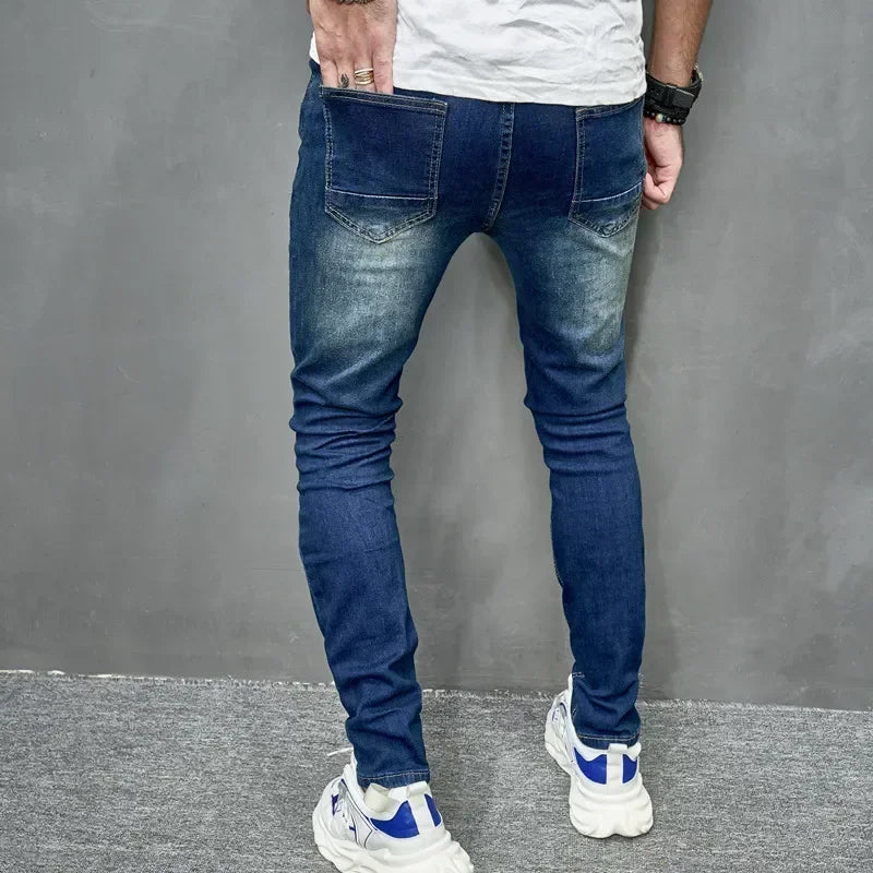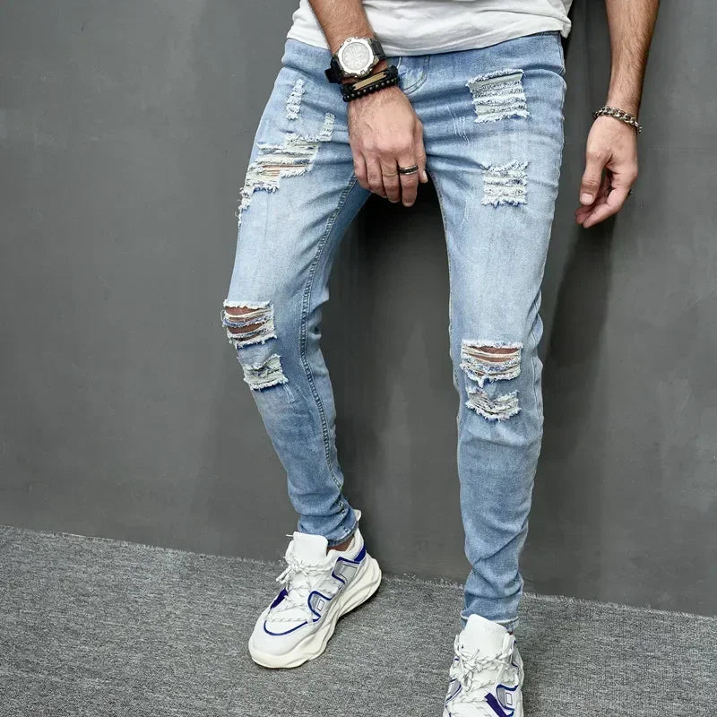 2024 New Style Men's Personalized Ripped Solid Color Skinny Jeans Stretch Little Foot Streetwear Motorcycle Denim Trousers Male